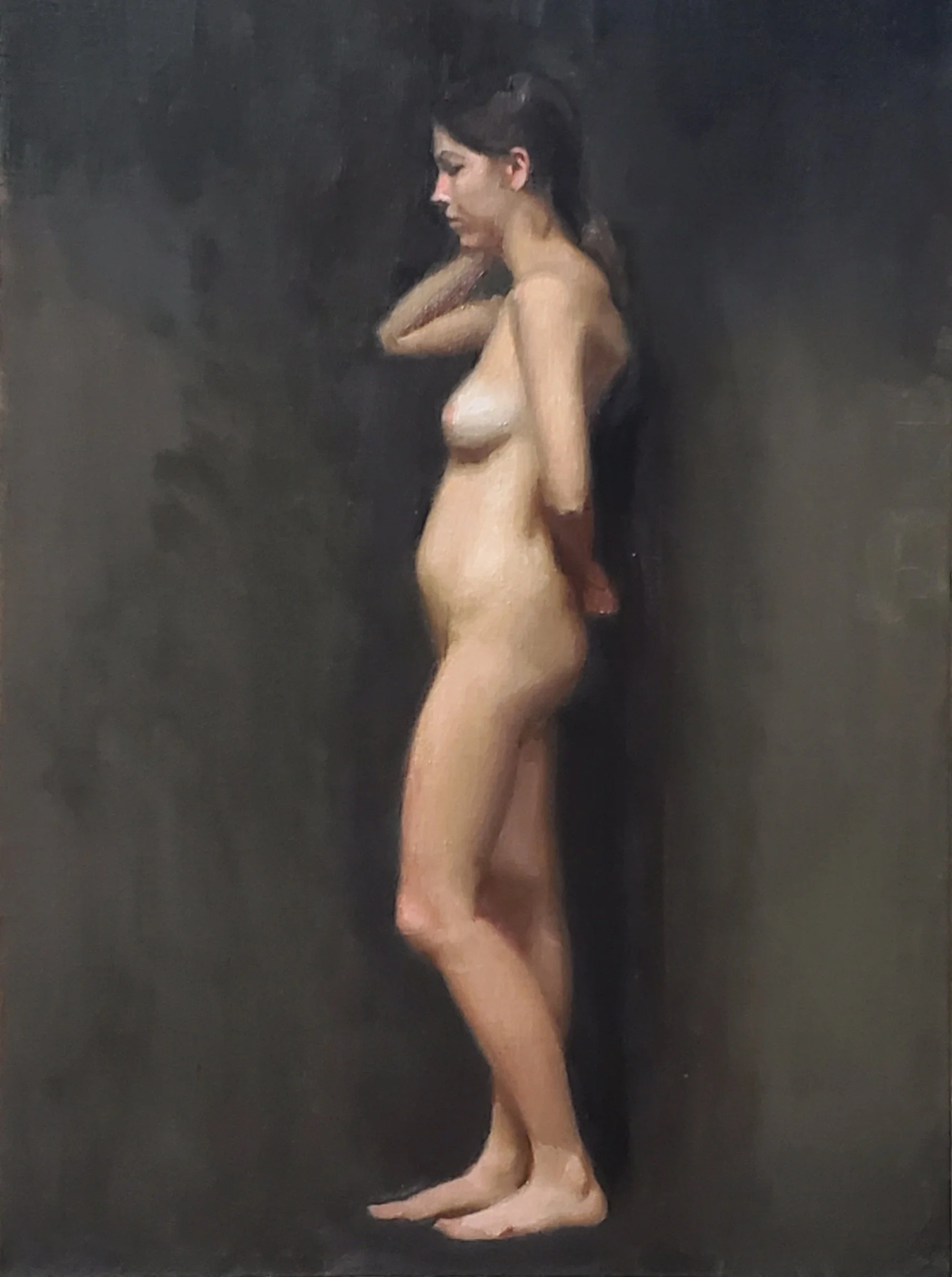 Woman Resting in Profile 2024 Oil on Linen, 45x65 cm. This piece was created from life. The profile view of a pose I painted previously from the front.